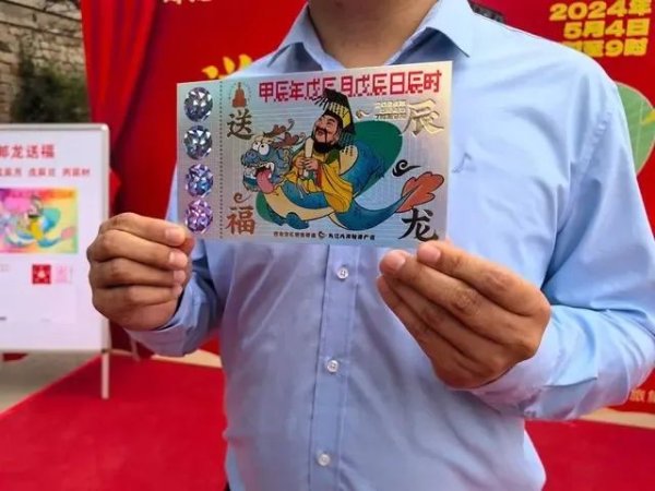 《辰龍送褔》明信片印有大運河源頭遺址公園都龍王廟的“龍王圖案”,明信片的左側(cè)運用了鐳射工藝,設(shè)置了“刮刮樂”模式,最高獎項可獲得一張居庸關(guān)長城景區(qū)的門票,明信片上印有“2024年5月4日7時至9時甲辰年戊辰月戊辰日丙辰時”的字樣,紀(jì)念意義十足。