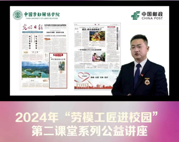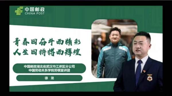 4月22日,由中國勞動關(guān)系學(xué)院主辦,教育部學(xué)生服務(wù)與素質(zhì)發(fā)展中心指導(dǎo)的2024年勞模工匠進(jìn)校園 第二課堂系列公益講座采取線上直播、線下宣講、課程展播形式開展,江岸區(qū)郵政分公司“全國五一勞動獎(jiǎng)?wù)隆鲍@得者徐龍受邀參加。