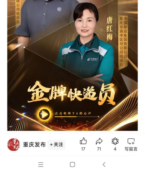 5月9日,由渝中區(qū)委宣傳部、渝中區(qū)委網(wǎng)信辦、渝中區(qū)文明辦、渝中區(qū)新時代文明實踐指導(dǎo)中心主辦,人民網(wǎng)重慶頻道承辦的2024年“渝中文明之星”評選中,渝中郵政攬投員唐紅梅獲得2024年“渝中文明之星——金牌快遞員”榮譽稱號。