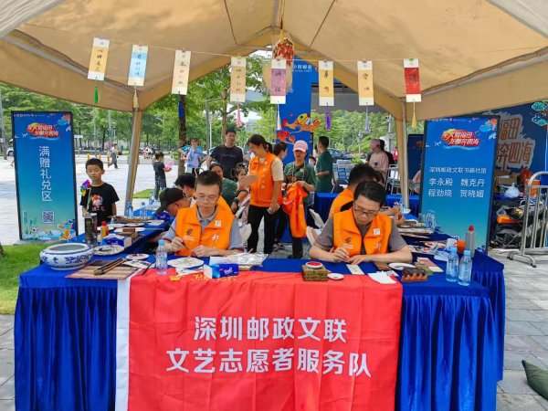 深圳市分公司文聯(lián)文藝志愿者服務隊受邀參與此次活動,在藝術(shù)書畫區(qū)設點進行現(xiàn)場創(chuàng)作,服務隊的六名員工即興揮毫,書寫出水墨丹青的無限意蘊?!皩庫o致遠”“蟾宮折桂”“金榜提名”……一幅幅蒼勁有力、清新淡雅的作品展示出郵政書畫家們精湛的書法技藝,吸引了廣大市民駐足欣賞。書法書簽、水墨畫紙扇、裝飾書畫……市民們領取各自心儀的作品,留下由衷的贊嘆。
