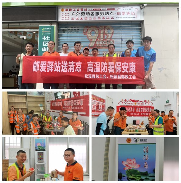 6月23-24日,南平市郵政工會聯(lián)合南平市總工會在延平寄遞事業(yè)部營業(yè)部郵愛驛站,松溪郵政工會聯(lián)合縣總工會在城北支局郵愛驛站,相繼開展了戶外勞動者高溫送清涼活動。驛站里陸續(xù)迎來了環(huán)衛(wèi)工人、快遞小哥、外賣小哥等戶外勞動者,工作人員提早準(zhǔn)備了爽口西瓜、菊花茶清涼飲品等為大家免費提供解暑歇息?!巴饷鎸嵲谔珶崃耍〗右粏闻芤惶司蜐M身大汗。沒想到走進郵政的驛站能吃上清涼甜脆的西瓜,可以加涼茶水、休息,還給我送防暑藥品,郵政驛站實在是讓我太滿意了!”外賣員小張高興地說。一杯杯清涼飲品、一塊塊解暑西瓜……暖心的關(guān)愛驅(qū)走了夏日的炎熱,讓戶外勞動者們感受到了濃濃的郵政溫情。