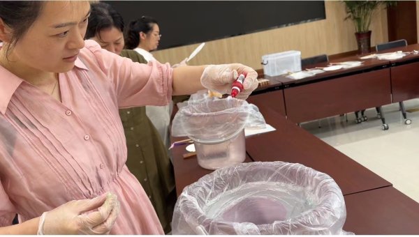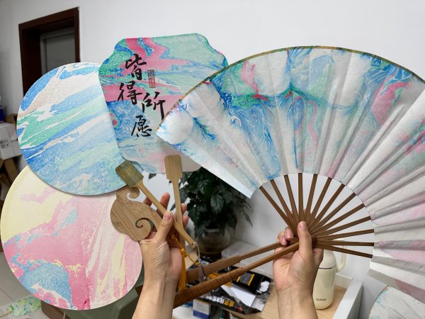 員工們根椐自已的喜好選擇紙?zhí)テ崞?,在老師的指導下認真調制墨水,再把紙?zhí)テ崞髀湃胨爸?,以漆為筆,以水為墨,在員工們期待中扇畫出現(xiàn)啦,哇噻,清水芙蓉、人間清醒、皆得所愿、清歡等一個個扇畫展現(xiàn)了。員工們用紙?zhí)テ崞?,通過漂漆工藝,以手造物,發(fā)物抵心制作的非遺漆扇禮物非常珍貴,紛紛表示將是自已的珍藏,員工們造物的驚喜無法言表。