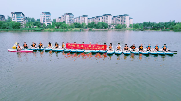 經(jīng)過(guò)教練認(rèn)真講解,大家快速了解了槳板運(yùn)動(dòng)的操作規(guī)范和動(dòng)作要領(lǐng)。做好安全措施后,一人一板一槳,大家勇敢開啟難忘的水上之旅。微風(fēng)拂面,垂柳慢搖,在波光粼粼的湖面上,大家從開始的陌生緊張,逐漸放松,慢慢的便可穩(wěn)坐在槳板上劃水前行了。膽大一些的,甚至可以在板上站立起來(lái)做高難度動(dòng)作了。落水了也沒(méi)關(guān)系,按照動(dòng)作要領(lǐng)調(diào)整身姿,再次翻身上板,繼續(xù)前行。