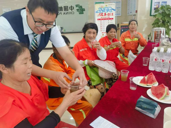 “師傅,天氣熱,喝點綠豆湯,歇一歇!”白沙四路網(wǎng)點郵愛驛站工作人員為奔波一上午的戶外工作者一一遞出清涼飲品,并為他們貼心準備了可口的西瓜。 負責(zé)張家灣街道路面道路清掃的環(huán)衛(wèi)工人劉鳳香接過綠豆湯,感動地說:“這么熱的天,能收到郵政送來的清涼,心里真的很舒服,謝謝你們!”