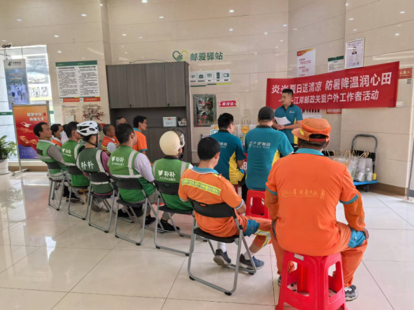 在上海路網(wǎng)點郵愛驛站,全國五一勞動獎?wù)芦@得者徐龍,作為戶外工作者的一份子,從如何避免高溫中暑、夏日戶外防暑必備物及使用方法、中暑之后的應(yīng)急措施等方面,為大家講解夏日防暑攻略,在場的戶外工作者紛紛表示這份防暑攻略提高了大家夏日防暑安全的重視,也學(xué)習(xí)到了很多關(guān)于如何防止中暑的方法。