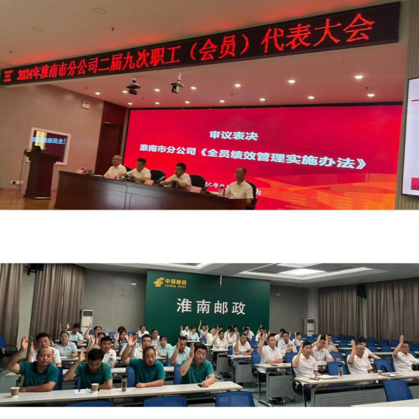 2024年8月28日,淮南市分公司召開第二屆第九次職工(會員)代表大會,會議審議表決了《淮南市郵政分公司全員績效考核辦法》(以下簡稱辦法)。 《辦法》對市分公司員工工作質效的量化考核方法,考核結果運用在員工年終績效獎勵中,是涉及員工切身利益的大事件。 為保障會議順利開展,市郵政工會提前將會議資料通過郵E聯(lián)群發(fā)給市分公司二屆職工代表,要求職工代表認真踐行職責,廣泛征求職工意見。 預備會議對代表資格審查進行審查、人數(shù)清點并通過會議議程;正式會議,市分公司人力資源部經理對《辦法》進行了詳細解讀并對代表們提出的問題進行了細致解答,經審議,代表們舉手表決全票通過了《辦法》。陶慶余主席做會議小結,并宣讀決議。 經職工(會員)代表表決通過的《辦法》將通過OA印發(fā),自發(fā)布之日起生效。