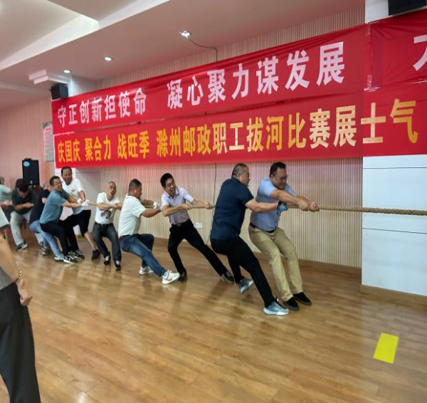 為慶祝迎接國慶七十五周年的到來,進(jìn)一步增強(qiáng)企業(yè)凝聚力,培養(yǎng)企業(yè)職工團(tuán)結(jié)協(xié)作精神,為了迎接旺季業(yè)務(wù)的來臨,提高職工身體素質(zhì)、健康水平,不斷豐富職工業(yè)余文體活動,9月20日下午,滁州市郵政工會在工會五樓多功能廳組織開展“慶國慶、聚合力、站旺季”職工拔河比賽活動。市本部各部門90余人參加比賽。 參賽選手們精神飽滿、斗志昂揚,哨聲響起后全體隊員提起氣勢、鉚足干勁,雙手緊握繩索,雙腳釘穩(wěn)地面,繩索中心的紅結(jié)忽左忽右,圍觀觀眾呼聲陣陣、掌聲雷鳴,比賽現(xiàn)場人頭攢動,氣氛異常熱烈。經(jīng)過3輪近11場次激烈較量,金融業(yè)務(wù)部、城區(qū)分公司、寄遞業(yè)務(wù)部獲得女子組前三名,渠道業(yè)務(wù)部、寄遞業(yè)務(wù)部、城區(qū)營業(yè)部獲得男子組前三名?;顒咏Y(jié)束后職工們紛紛表示:“這樣的活動讓我們既放松了心情,也鍛煉了身體,希望工會以后能多開展此類活動。”