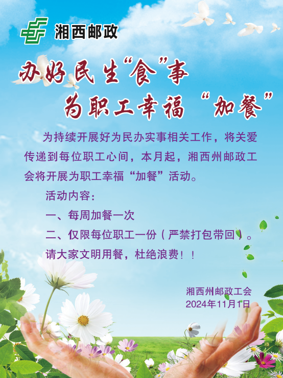 關(guān)愛員工是企業(yè)文化建設(shè)的基礎(chǔ),為職工幸?!凹硬汀笔顷P(guān)愛員工的重要舉措。下一步,湘西州郵政工會將持續(xù)開展為職“加餐”活動,在優(yōu)化服務(wù)上下功夫、在滿意度上求實效、讓職工幸福感成色更足。