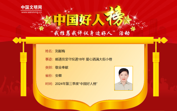2024年第三季度“中國好人榜”阜陽郵政投遞員劉獻(xiàn)梅上榜獲評(píng)敬業(yè)奉獻(xiàn)類好人。劉獻(xiàn)梅,中國郵政集團(tuán)有限公司阜陽市分公司投遞員。從事投遞工作18年來,劉獻(xiàn)梅每天的投遞路線長達(dá)50公里,投遞的報(bào)刊達(dá)80多種,重達(dá)50公斤,每天投遞兩次,創(chuàng)建“愛心郵路”7條,義務(wù)服務(wù)9位老人。18年投遞路,劉獻(xiàn)梅在平凡崗位上默默堅(jiān)守,把每一封信件、每一份報(bào)刊,準(zhǔn)時(shí)準(zhǔn)確送達(dá)用戶手中,獲得了用戶和周邊居民的認(rèn)可和好評(píng)。劉獻(xiàn)梅曾榮獲全國五一勞動(dòng)獎(jiǎng)?wù)?、安徽省勞?dòng)模范、安徽省郵政優(yōu)秀投遞員等榮譽(yù)。