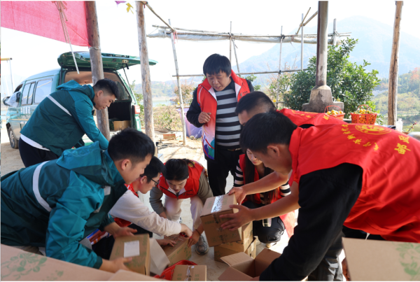 “我來(lái)裝,你來(lái)搬,咱們加快速度?!惫麍@外,還有一群郵政志愿者們分工明確,裝箱、打包、貼單,個(gè)個(gè)干勁十足、默契滿滿。不一會(huì)兒,郵車上已經(jīng)裝滿了一箱箱新鮮優(yōu)質(zhì)的慈口蜜桔,這些橘子將乘坐著郵車“走”出大山,“走”向全國(guó)。