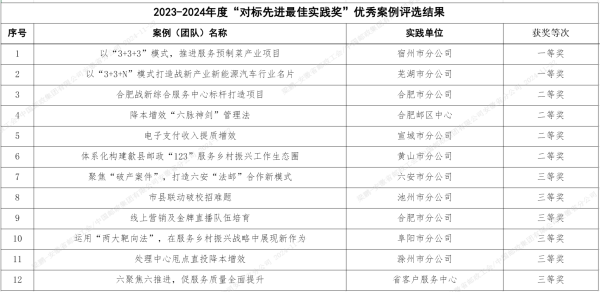 近日,省分公司、省郵政工會(huì)印發(fā)了《關(guān)于表彰2023-2024年度全省郵政“對(duì)標(biāo)先進(jìn)最佳實(shí)踐獎(jiǎng)”優(yōu)秀案例的通報(bào)》(皖郵分〔2024〕453號(hào)),評(píng)選表彰了12個(gè)“對(duì)標(biāo)先進(jìn)最佳實(shí)踐獎(jiǎng)”優(yōu)秀案例,具體案例名稱如下: