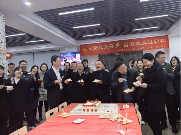 活動(dòng)現(xiàn)場(chǎng)“切蛋糕 步步高”的環(huán)節(jié),湖州市分公司領(lǐng)導(dǎo)們一起把切好的蛋糕分發(fā)給在場(chǎng)的每一個(gè)人,大家一起品嘗著這份甜蜜。在這一刻,大家共同許下了美好的心愿,祝福湖州郵政2025“新躍升”的關(guān)鍵年乘風(fēng)破浪、再上新臺(tái)階!
