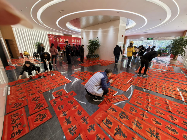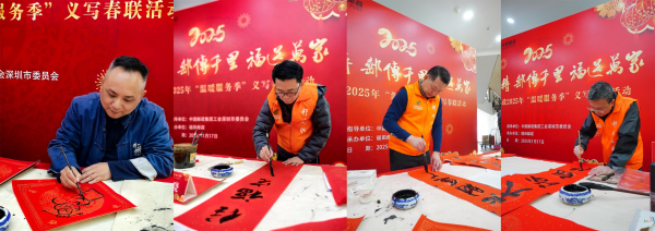 活動(dòng)中,深圳郵政文聯(lián)書畫社團(tuán)的成員現(xiàn)場(chǎng)揮毫?xí)鴮懘郝?lián)。他們凝神靜氣,每一筆都蘊(yùn)含著對(duì)新年的美好祝愿。一張張喜慶的紅紙上,春聯(lián)和福字躍然其上,洋溢著濃濃的節(jié)日氣氛。
