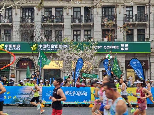 為展示企業(yè)文化和郵政員工的良好精神風(fēng)貌,按照湖北省郵政工會的統(tǒng)一部署,武漢市郵政工會組織了三支啦啦隊于比賽當(dāng)天分別在江漢路、六渡橋和彭劉楊路網(wǎng)點(diǎn)門口的賽道旁為選手鼓勁加油、吶喊助威。這三個郵政網(wǎng)點(diǎn)不僅沿街緊靠賽道、是選手們的必經(jīng)之路,同時各有特色:江漢路郵局2024年新裝改造后以咖啡郵局華麗轉(zhuǎn)身,一開業(yè)就吸引了不少年輕人前來打卡,六渡橋郵局寫滿了老漢口的城市記憶,彭劉楊路郵局更是以年輕的身影煥發(fā)著百年郵政的生機(jī)和活力。武昌區(qū)分公司、江岸區(qū)分公司、江漢區(qū)分公司高度重視,精心組織,每個區(qū)分公司提前分別挑選了15名青年員工組成啦啦隊,配上省分公司統(tǒng)一制作的主題為“櫻花季 郵精彩 越江湖”“湖北郵政為熱愛加速”“湖北郵政見證你的每一公里”的紅色宣傳橫幅、醒目郵政logo的綠色馬甲、白色的運(yùn)動帽、粉色的手搖宣傳板,郵政啦啦隊的氣場十足。