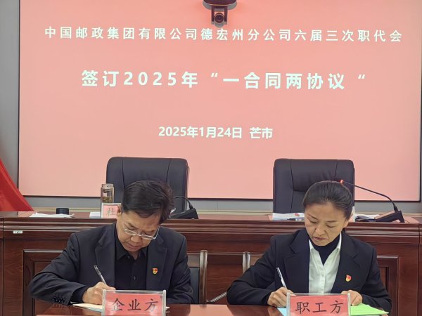 大會總結(jié)2024年工作,部署2025年任務(wù),會議聽取了州分公司黨委書記、總經(jīng)理杜國祥所作的題為“攻堅克難勇?lián)斣鰪娔芰μ豳|(zhì)效持續(xù)推動德宏郵政高質(zhì)量發(fā)展”的行政工作報告和州郵政工會主席段春燕作的題為“夯基礎(chǔ) 強服務(wù)勇?lián)?凝心聚力為德宏郵政高質(zhì)量發(fā)展貢獻力量”的工會工作報告。大會通過了職代會四個專門委員會的工作報告和2024年“一合同兩協(xié)議”履行情況報告,以及工代會的工會財務(wù)、女工委、經(jīng)審工作報告,職工代表對州分公司領(lǐng)導(dǎo)班子及成員進行了民主評議,企業(yè)與工會簽訂了2025年《中國郵政集團有限公司德宏州分公司集體合同》《中國郵政集團有限公司德宏州分公司工資集體協(xié)商專項協(xié)議》《中國郵政集團有限公司德宏州分公司女職工特殊保護專項協(xié)議》。
