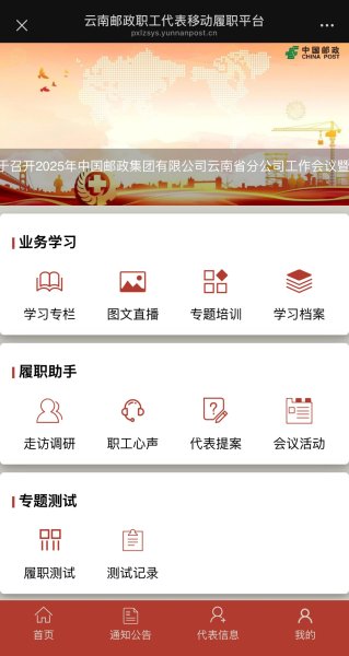 為不斷強(qiáng)化云南郵政職工代表政治素養(yǎng)、建言履職等一系列能力,充分發(fā)揮職工代表動(dòng)員、引導(dǎo)廣大職工積極支持、主動(dòng)參與企業(yè)改革發(fā)展的作用,云南郵政工會(huì)會(huì)同省信息技術(shù)中心開發(fā)上線了“云南郵政職工代表移動(dòng)履職平臺(tái)”(以下簡稱“平臺(tái)”)。該“平臺(tái)”集學(xué)習(xí)培訓(xùn)、專題測試、移動(dòng)履職等三個(gè)主要功能于一身,旨在通過信息技術(shù)手段提高職工代表的履職能力和效率。