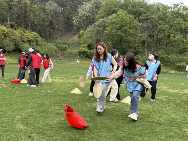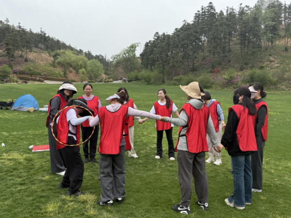 在團(tuán)隊(duì)展示環(huán)節(jié)結(jié)束后,激動(dòng)人心的拓展活動(dòng)正式拉開帷幕。第一個(gè)游戲“呼啦圈穿越”極具挑戰(zhàn)性,要求所有隊(duì)員手拉手,在不松手的情況下,讓呼啦圈依次穿越整支隊(duì)伍。比賽過程中,各小組隊(duì)員齊心協(xié)力、默契配合,或采用巧妙的肢體動(dòng)作,或制定獨(dú)特的穿越策略,現(xiàn)場(chǎng)加油聲、歡笑聲此起彼伏。第二個(gè)趣味游戲“趕雞進(jìn)籠”同樣精彩紛呈,各小組可選擇2名隊(duì)員參賽,隨著一聲令下,隊(duì)員們迅速揮動(dòng)扇子,將公雞形狀的氣球趕向籠子,隨后第二名隊(duì)員接力,大家爭(zhēng)分奪秒,現(xiàn)場(chǎng)氣氛緊張又歡樂。有的小組配合默契,很快便將“雞”全部趕入籠中;有的小組雖遇到一些小插曲,但在隊(duì)員們的共同努力下,也順利完成挑戰(zhàn)。而“水果配對(duì)”游戲則考驗(yàn)著隊(duì)員們的記憶力與協(xié)作能力。兩人一組,每次同時(shí)掀開兩頂帽子,若水果相同則成功配對(duì),若不同則需蓋回帽子返回起點(diǎn)。游戲過程中,隊(duì)員們仔細(xì)觀察、相互提醒,在規(guī)定時(shí)間內(nèi)努力完成全部配對(duì)任務(wù)。大家在游戲中相互鼓勵(lì)、共同進(jìn)步,充分體會(huì)到了團(tuán)隊(duì)協(xié)作的重要性。