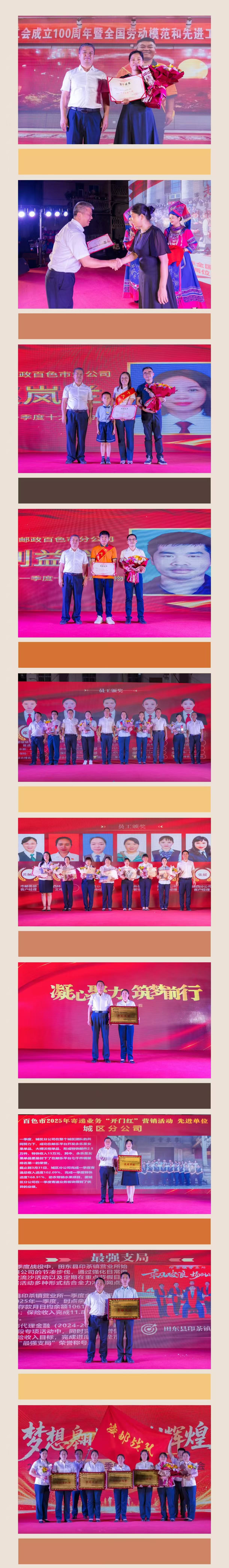 為表彰先進(jìn)、樹立榜樣,4月28日晚,百色市分公司在一樓大院舉行2025年一季度開門紅表彰大會(huì),參加表彰大會(huì)的人員有:市分公司領(lǐng)導(dǎo)班子,市分公司本部各部門領(lǐng)導(dǎo),十大感動(dòng)人物獲獎(jiǎng)人員及家屬;各縣級(jí)分公司、城區(qū)分公司、城區(qū)寄遞事業(yè)部領(lǐng)導(dǎo)班子;各縣級(jí)分公司、城區(qū)分公司金融業(yè)務(wù)部經(jīng)理、督訓(xùn)師、代理金融網(wǎng)點(diǎn)支局長(zhǎng);城區(qū)寄遞事業(yè)部攬投部經(jīng)理;金融、渠道、郵務(wù)、寄遞板塊獲獎(jiǎng)人員。