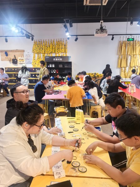 參觀結(jié)束后,活動(dòng)進(jìn)入倍受期待的動(dòng)手環(huán)節(jié)?!靶⌒≡O(shè)計(jì)師”們認(rèn)真地做著自己挑選的小物件,星際燈塔的小夜燈、二八杠自行車模型拼裝和個(gè)性化T桖彩繪。在專業(yè)老師的指導(dǎo)下,親子家庭齊動(dòng)手:拼接零件、裁剪材料、組裝裝飾……小朋友們專注地調(diào)試小夜燈的電路、繪制T桖圖案,家長(zhǎng)則化身“助手”,協(xié)助完成精細(xì)的模型拼裝。片刻間,一件件充滿創(chuàng)意的作品陸續(xù)誕生了。大小朋友們體會(huì)到了親手制作的樂趣和完成作品的成就感!
