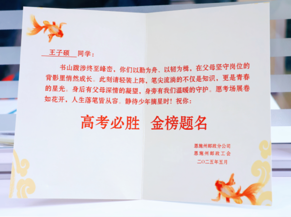 5月30日,恩施州郵政工會(huì)組織各縣市郵政工會(huì)開(kāi)展了一場(chǎng)溫情滿滿的考前慰問(wèn)活動(dòng),向全州即將踏上高考考場(chǎng)的43名郵政職工子女傳遞了組織的關(guān)懷與力量。